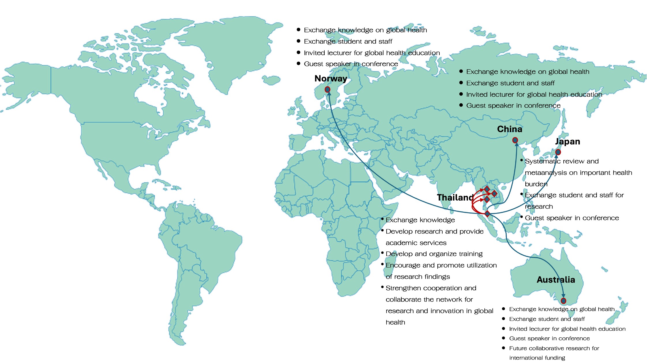 Collaborative research and academic exchange will be conducted with the country network in Australia, China, Japan and Norway to enhance the capacity building in global health and strengthen the research for health and well-bein
